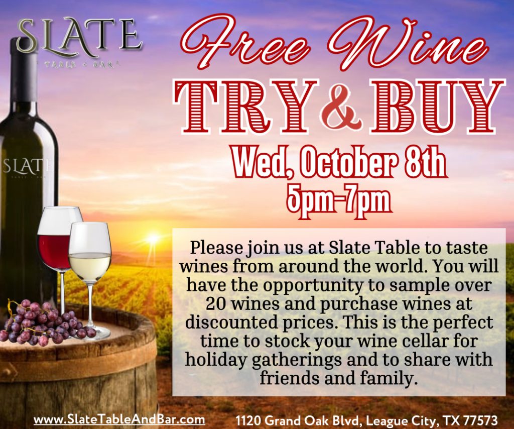 Please join us at Slate Table + Bar to taste wines from around the world. You will have the opportunity to sample over 20 wines and purchase wines at discounted prices. This is the perfect time to stock your wine cellar for holiday gatherings and to share with friends and family.